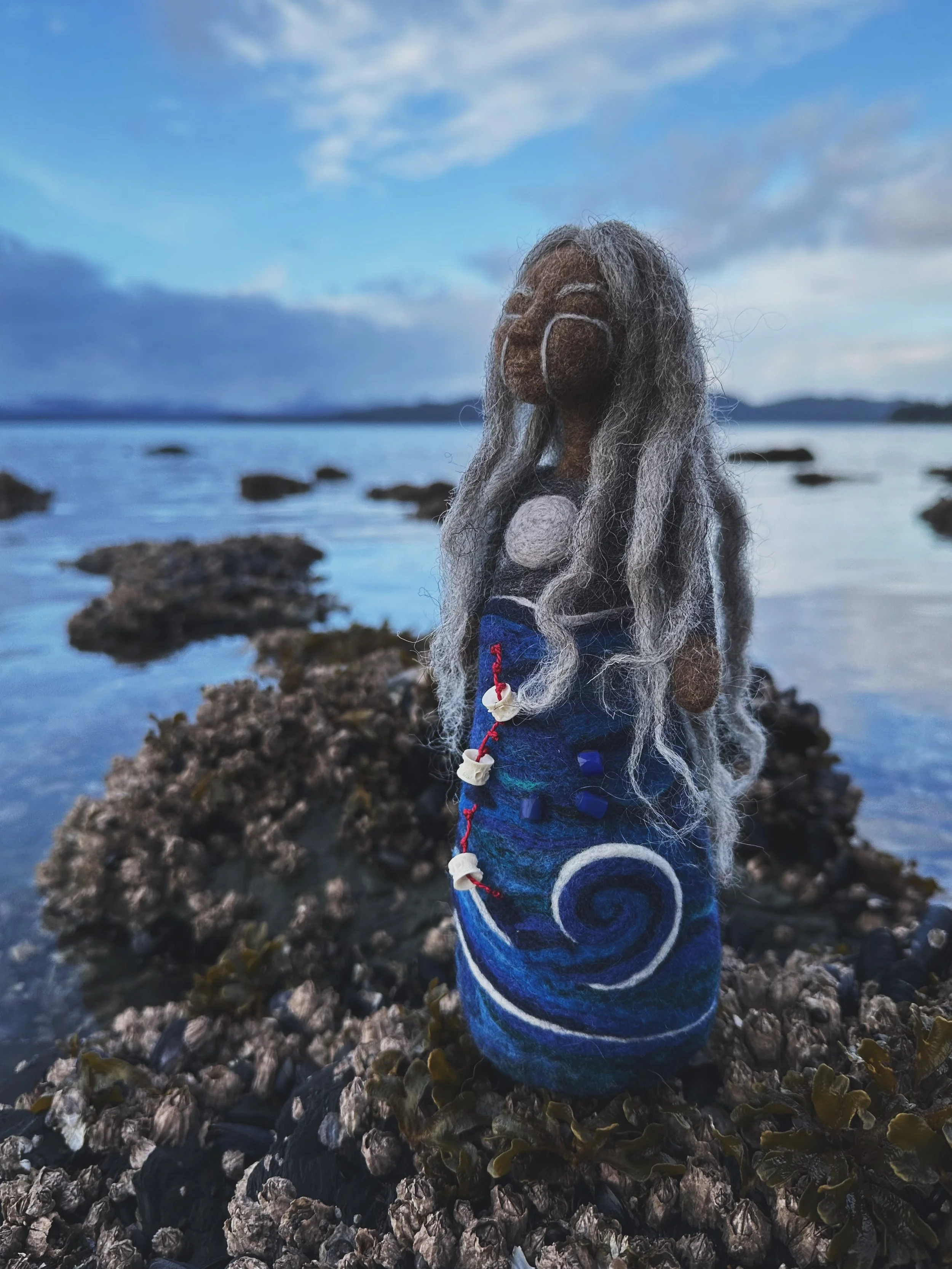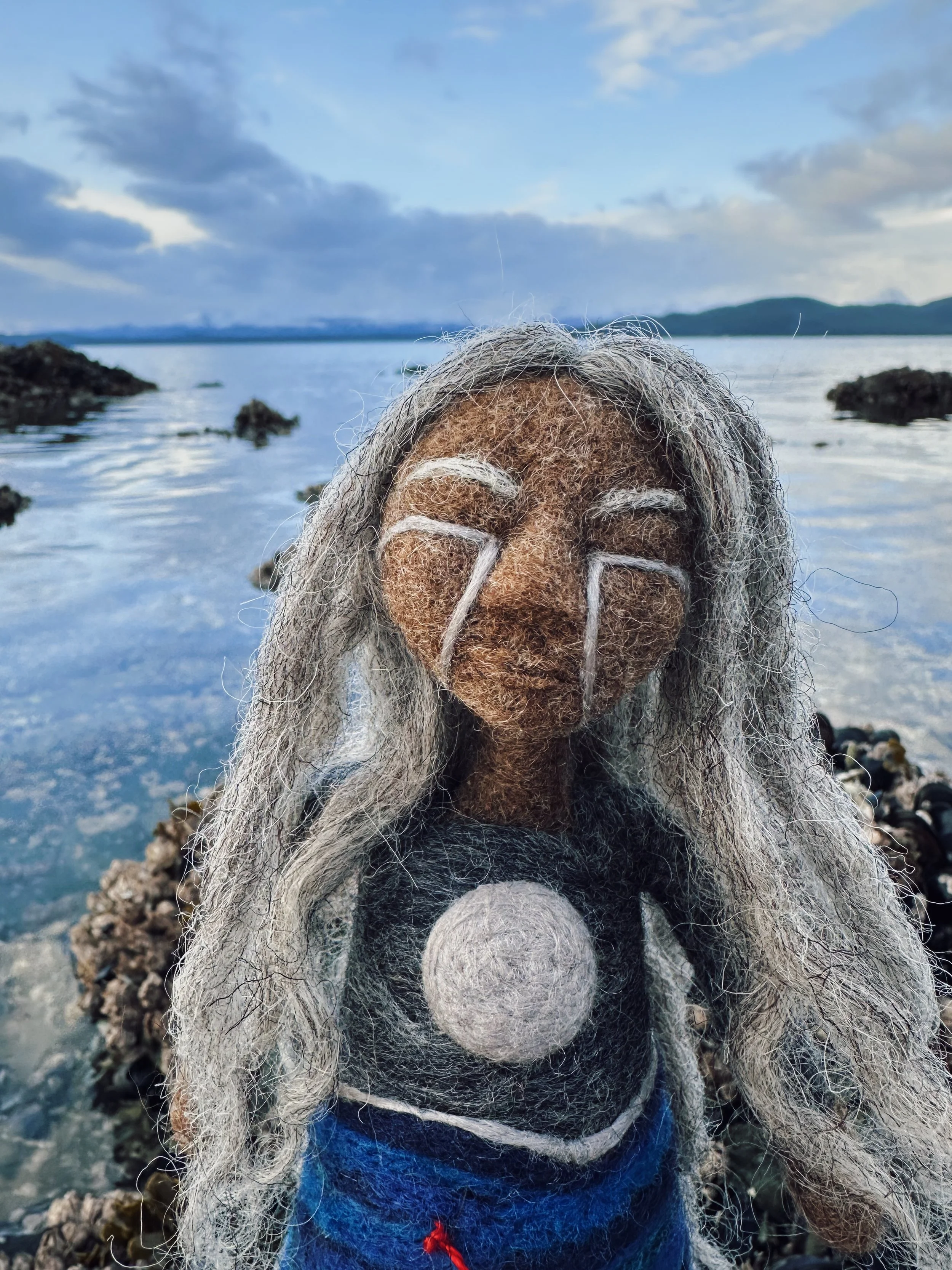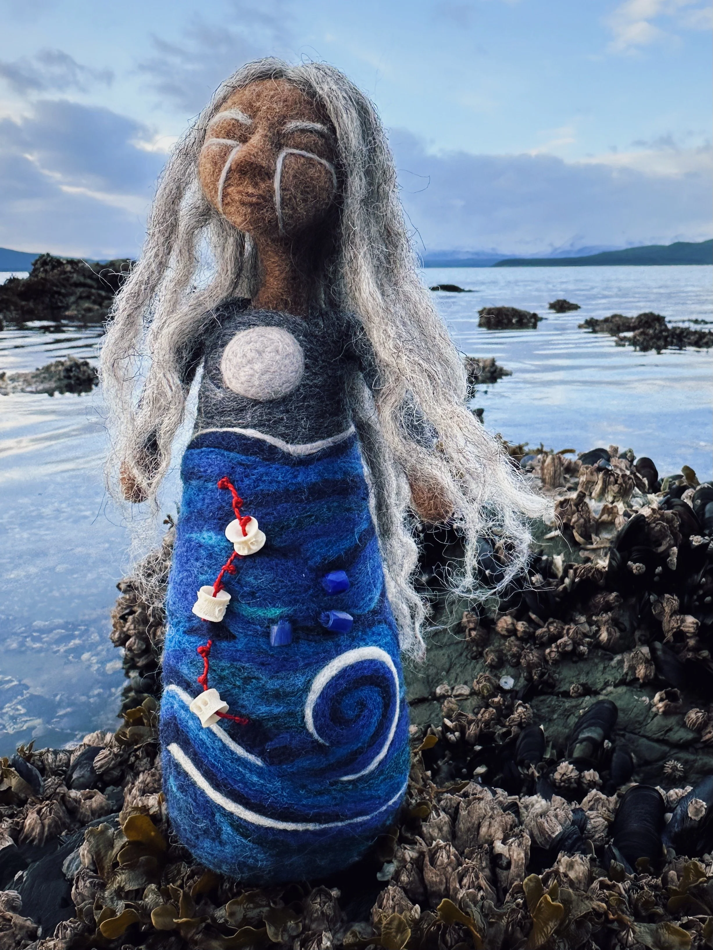 I reached deep into the well of my grief, and my tears sang this doll into being. This spirit holds within her the cycles of life, death, and rebirth. She wears a gown of ocean waves and is adorned with salmon bones on red thread, representing the water, blood, and bones that connect us to each other and to the earth. The thread is tied with nine knots (3x3) - each knot a spell for protection and remembrance. She wears three blue Russian trade beads that I received as a gift. They shine on the blue waves of her gown, honoring the love that persists even in the face of unrelenting grief.