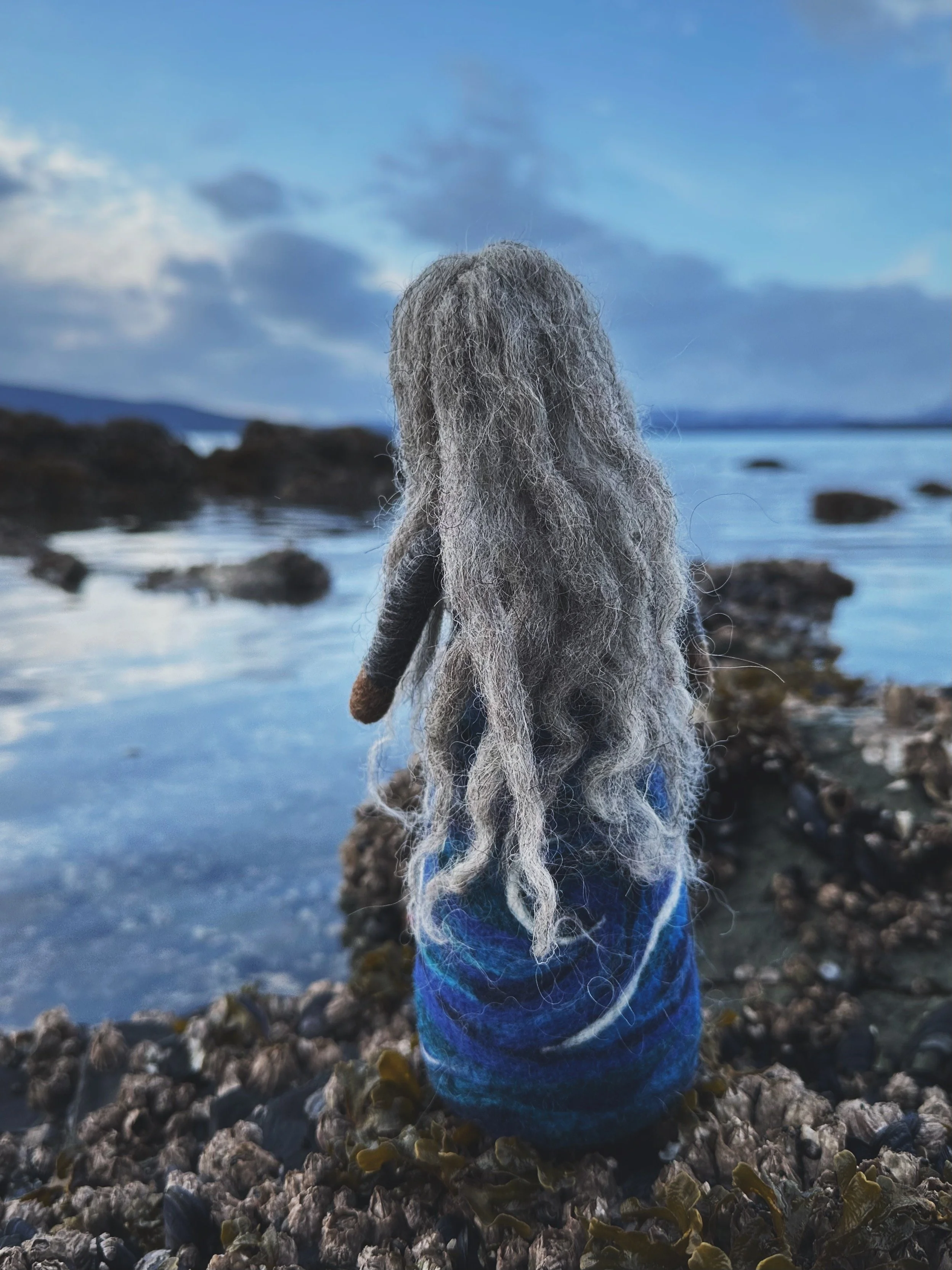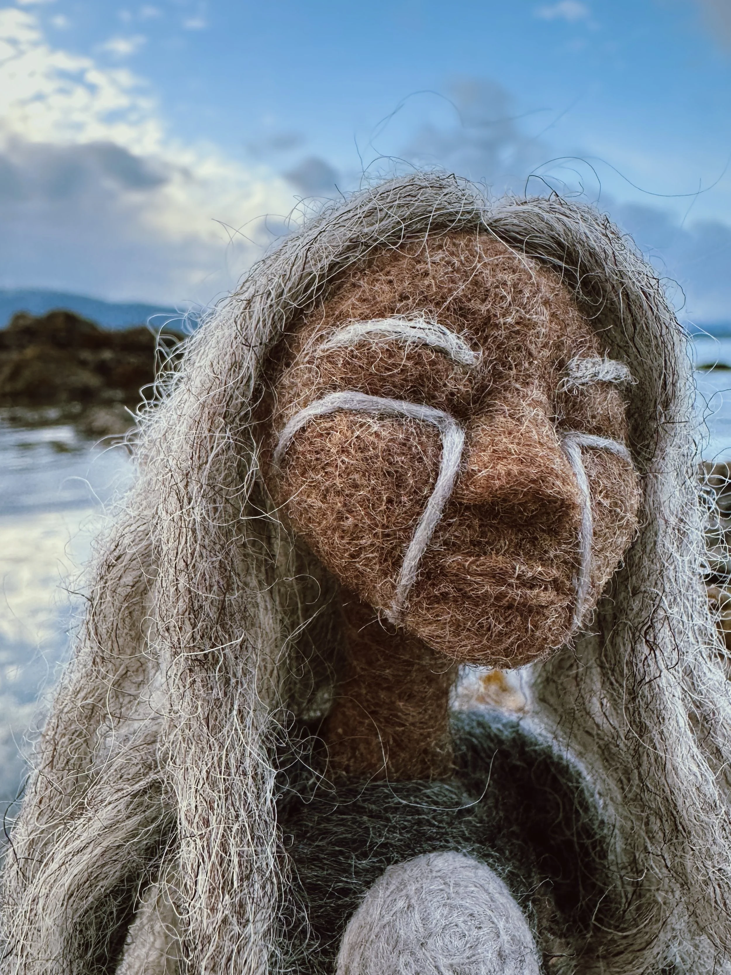 This doll is carries the spirit of the moon, the ocean, and ancestors of blood and bone. She serves as a vessel to carry my grief.
