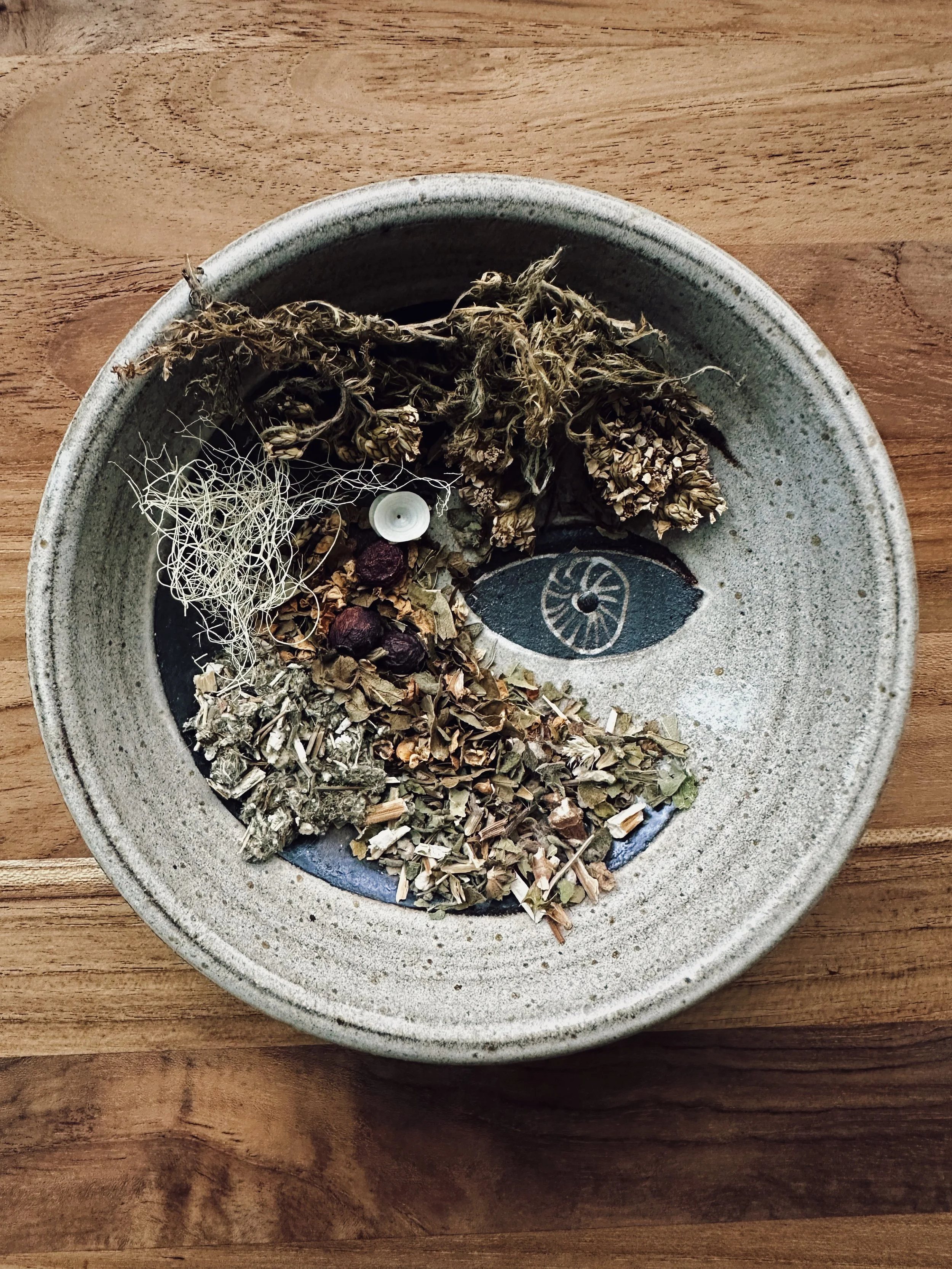 I’ve chosen mugwort, hawthorn, yarrow, usnea, motherwort, and salmon bone for the heart of this doll - medicine for thresholds, journeying in liminal spaces, protection, healing, spirit connection, and nervous system tending.