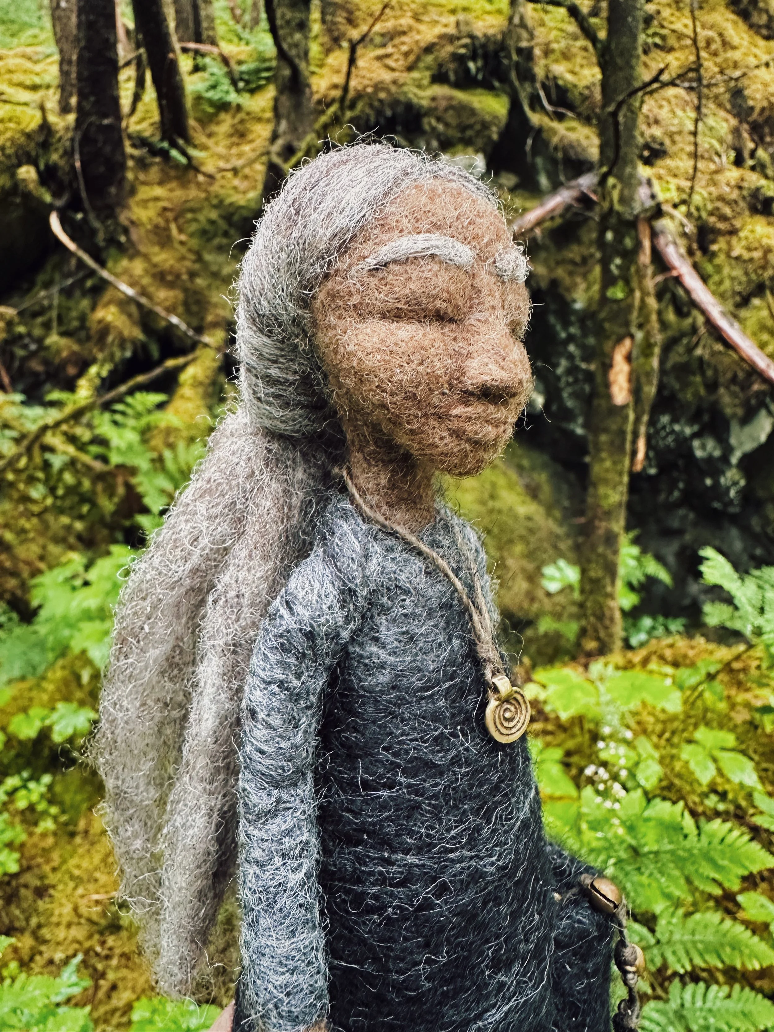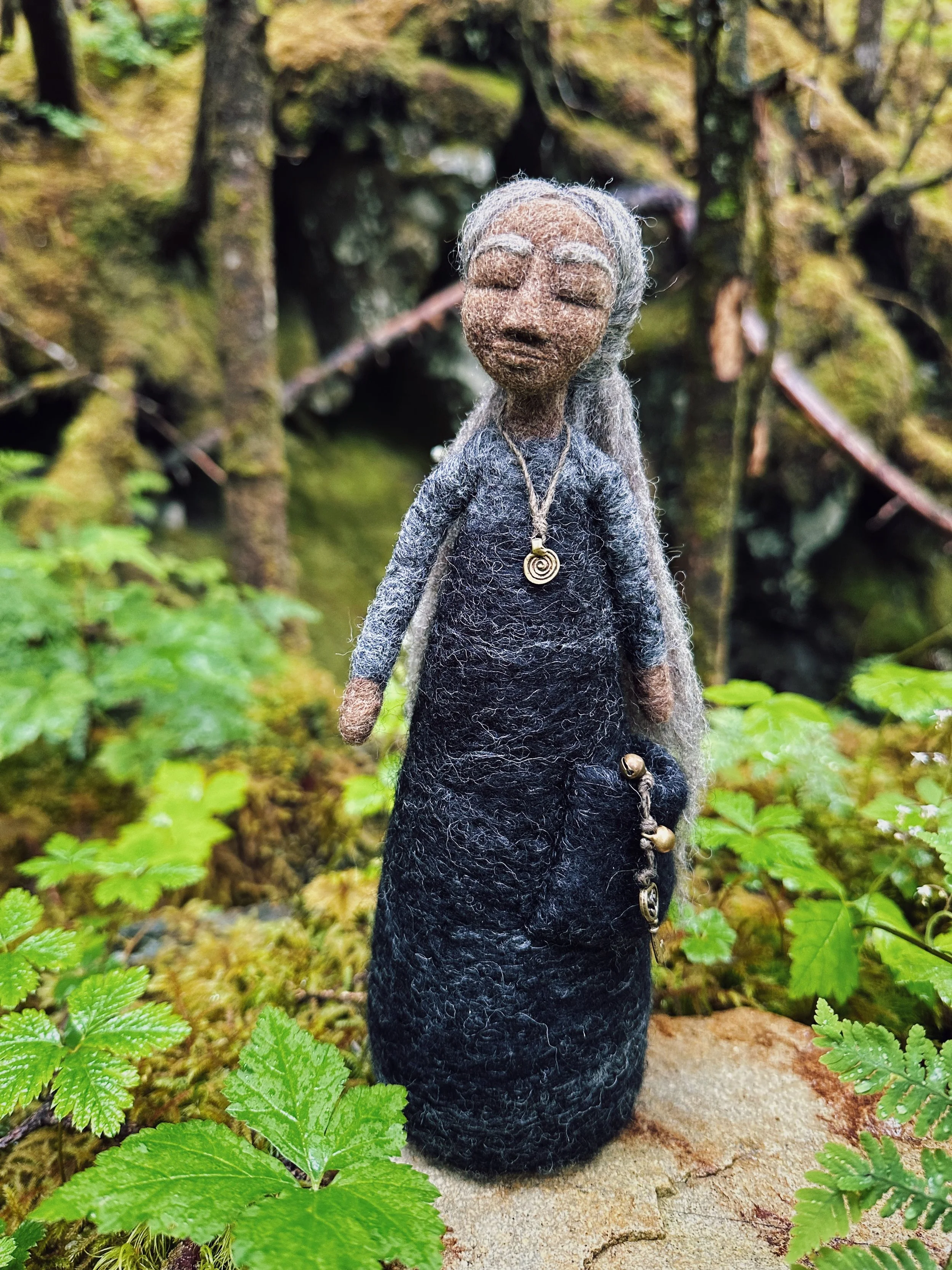 She wears a dress of Corriedale wool and carries a witch’s ladder and key in her pocket. Woven from hand-spun nettle thread, each knot of her witch’s ladder is a spell and a prayer - for protection, clear communication, and strong boundaries.