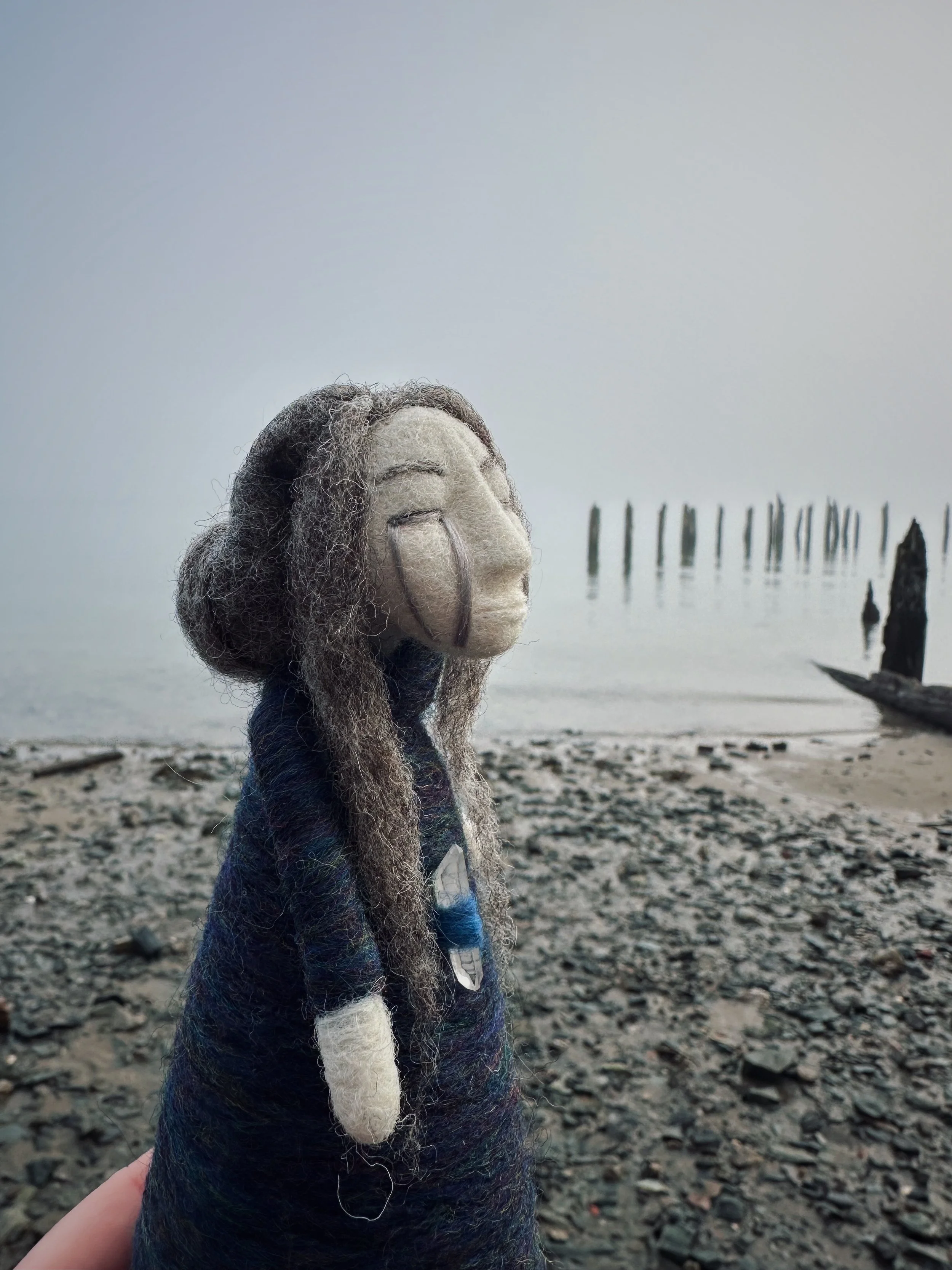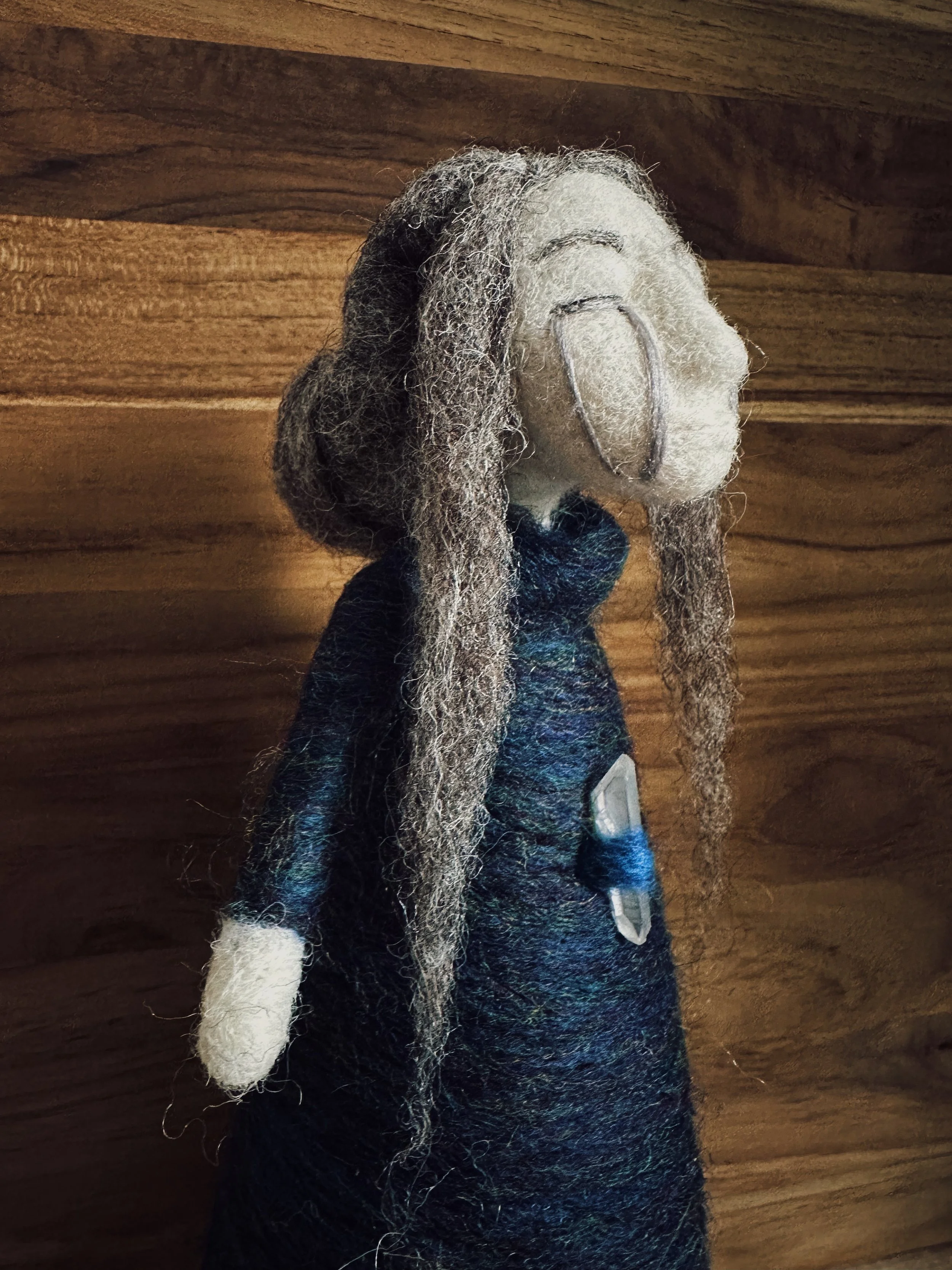 This doll, filled with mugwort, rose, and moonstone, is a companion to sit with you as you allow yourself to grieve. Her tears are woven with tussah silk and her dress is woven of Corriedale wool. She wears a small, double terminated quartz over her heart - and if you look closely, you’ll see the tiny baby (or, “barnacle”) quartz point on the side.