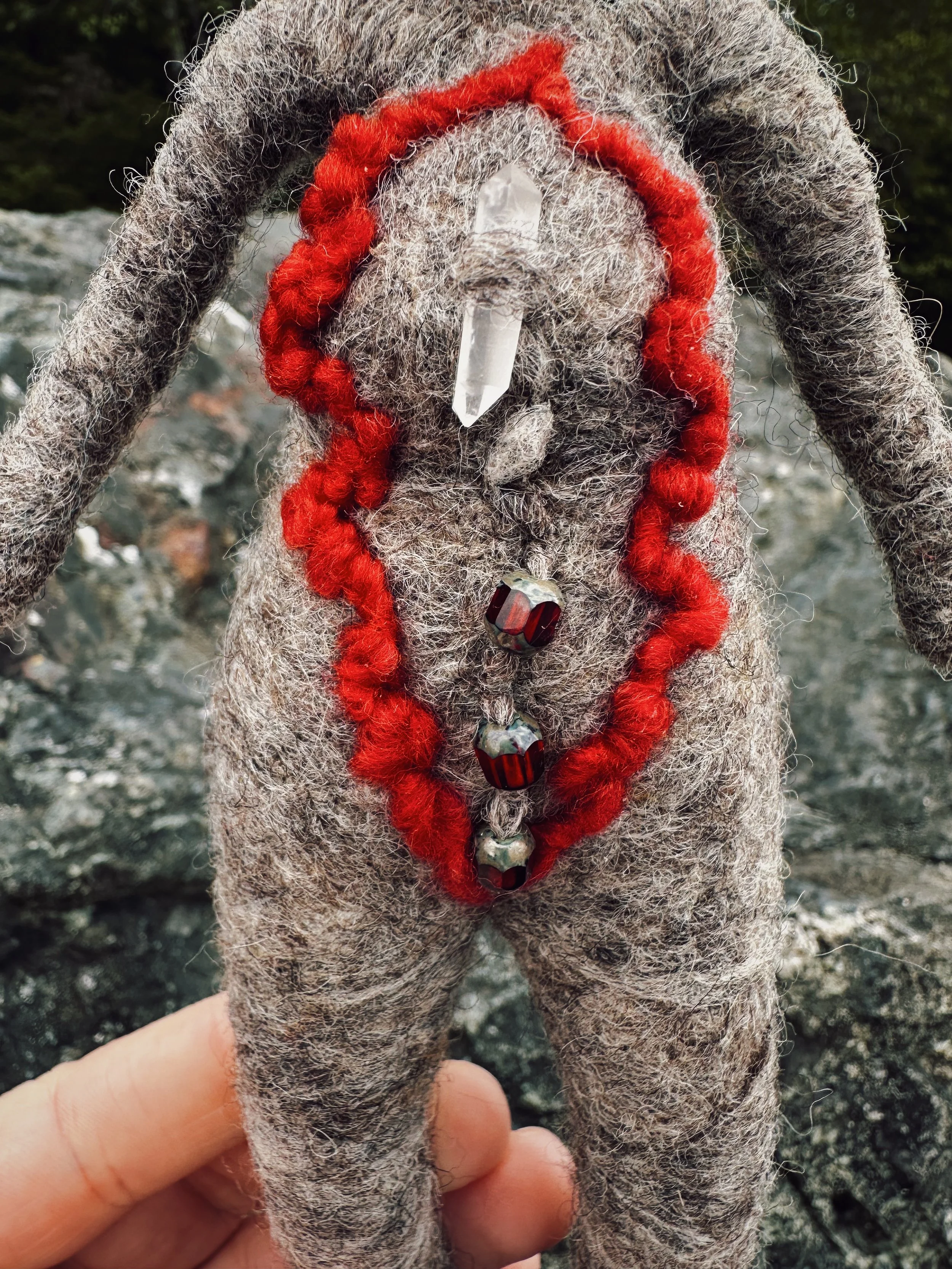 I’ve adorned both dolls with red glass beads - with a single bead representing the seed at menarche that blossoms more fully as the cycling years progress. Small, double-terminated quartz crystals over the heart space represent enhanced intuitive wisdom and spiritual connection. The large doll is also adorned with red wool to represent the flow of creativity and power.
