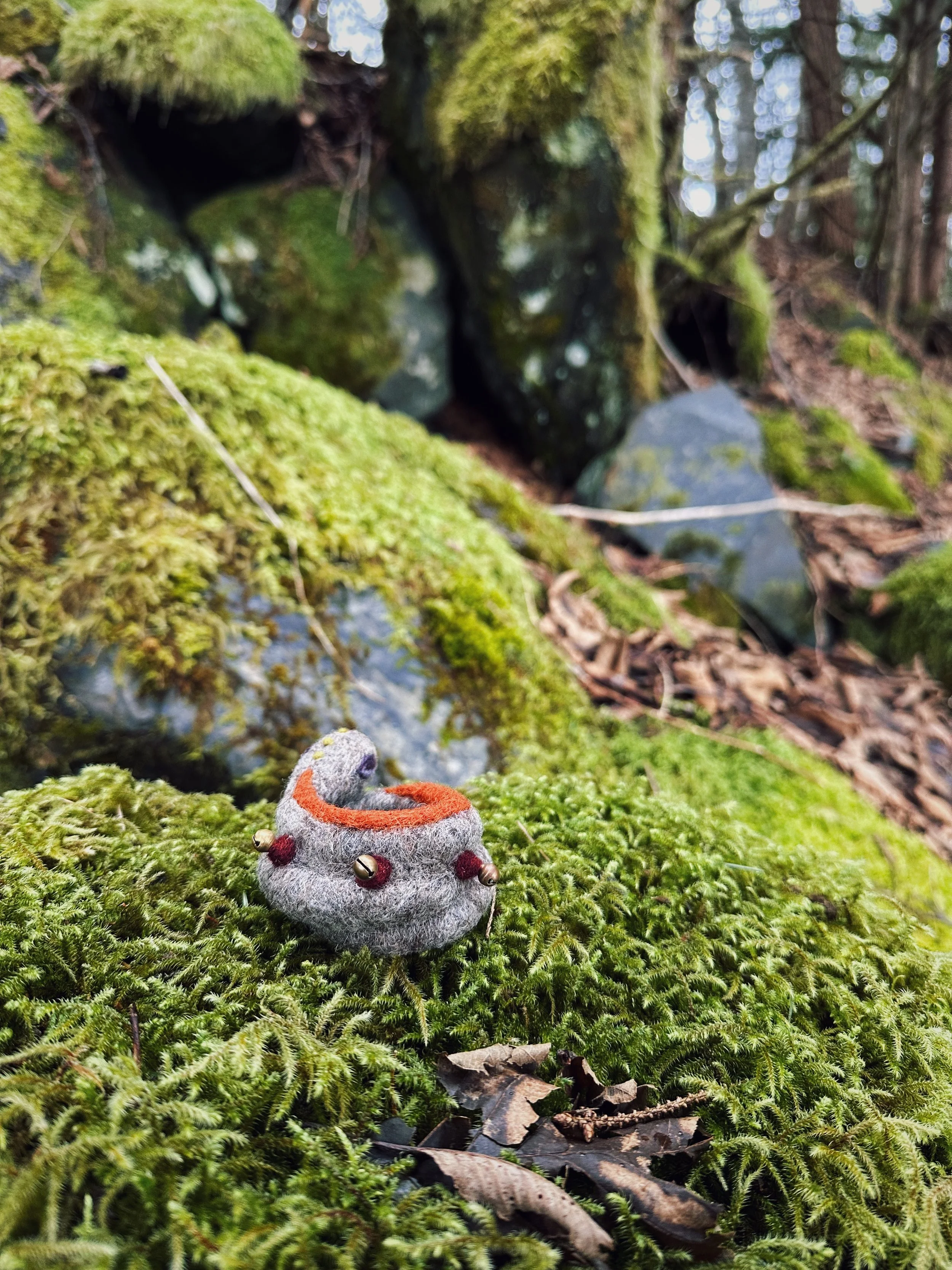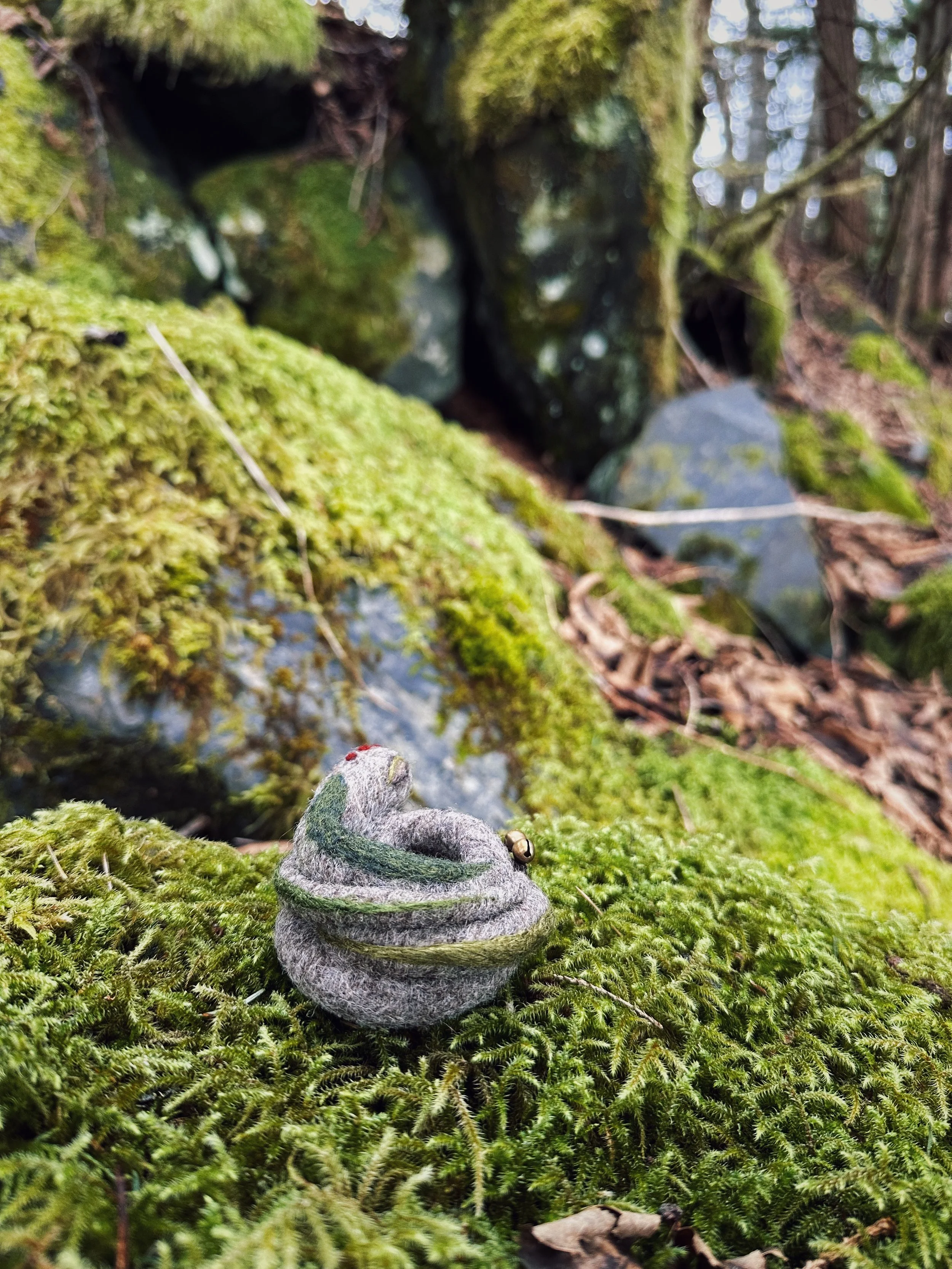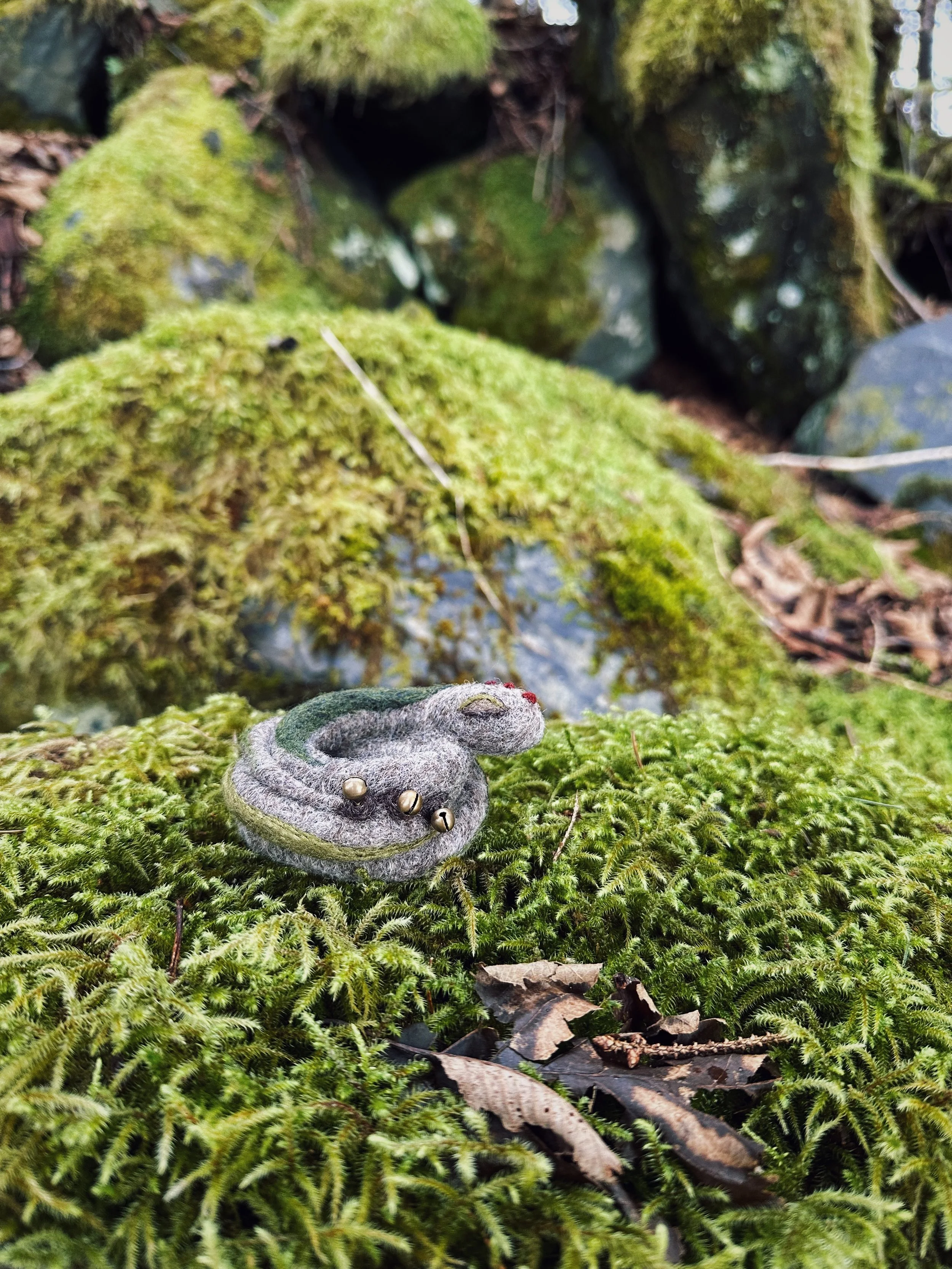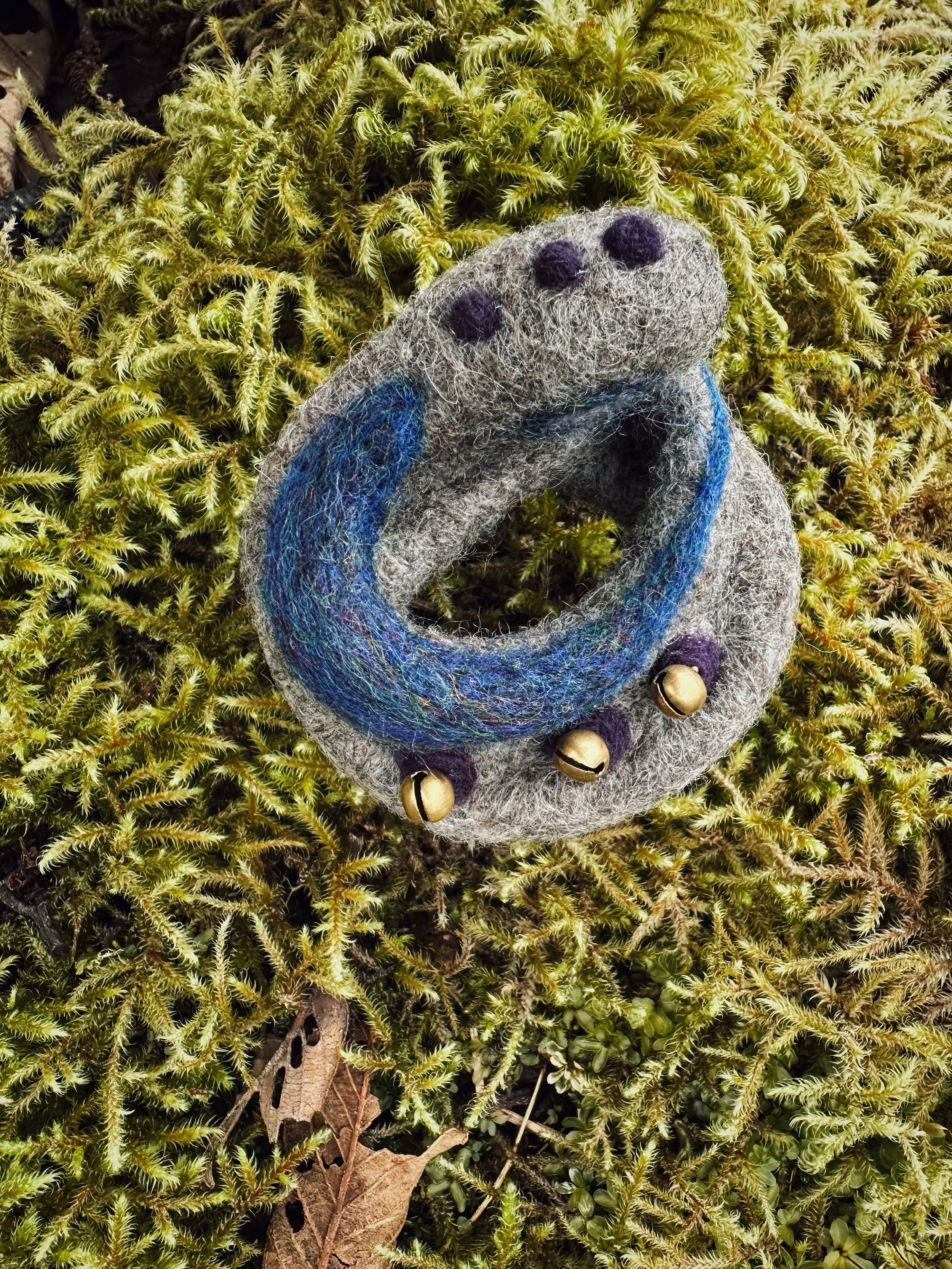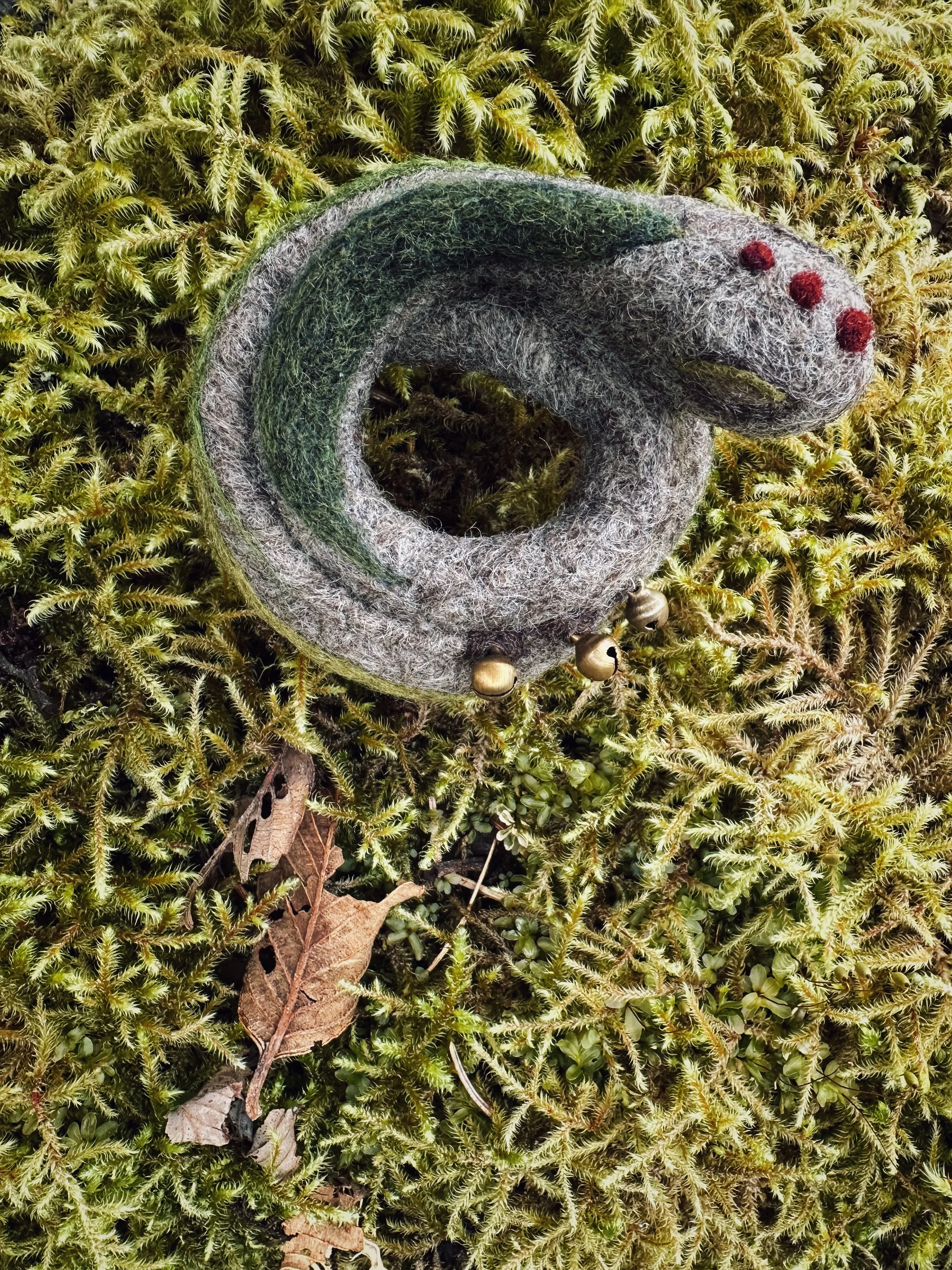 {Each snake talisman is crafted with museling-free wool and tussah silk and carries organic mugwort and naturally shed snakeskin. They were needle-felted by hand, with love and intention.}