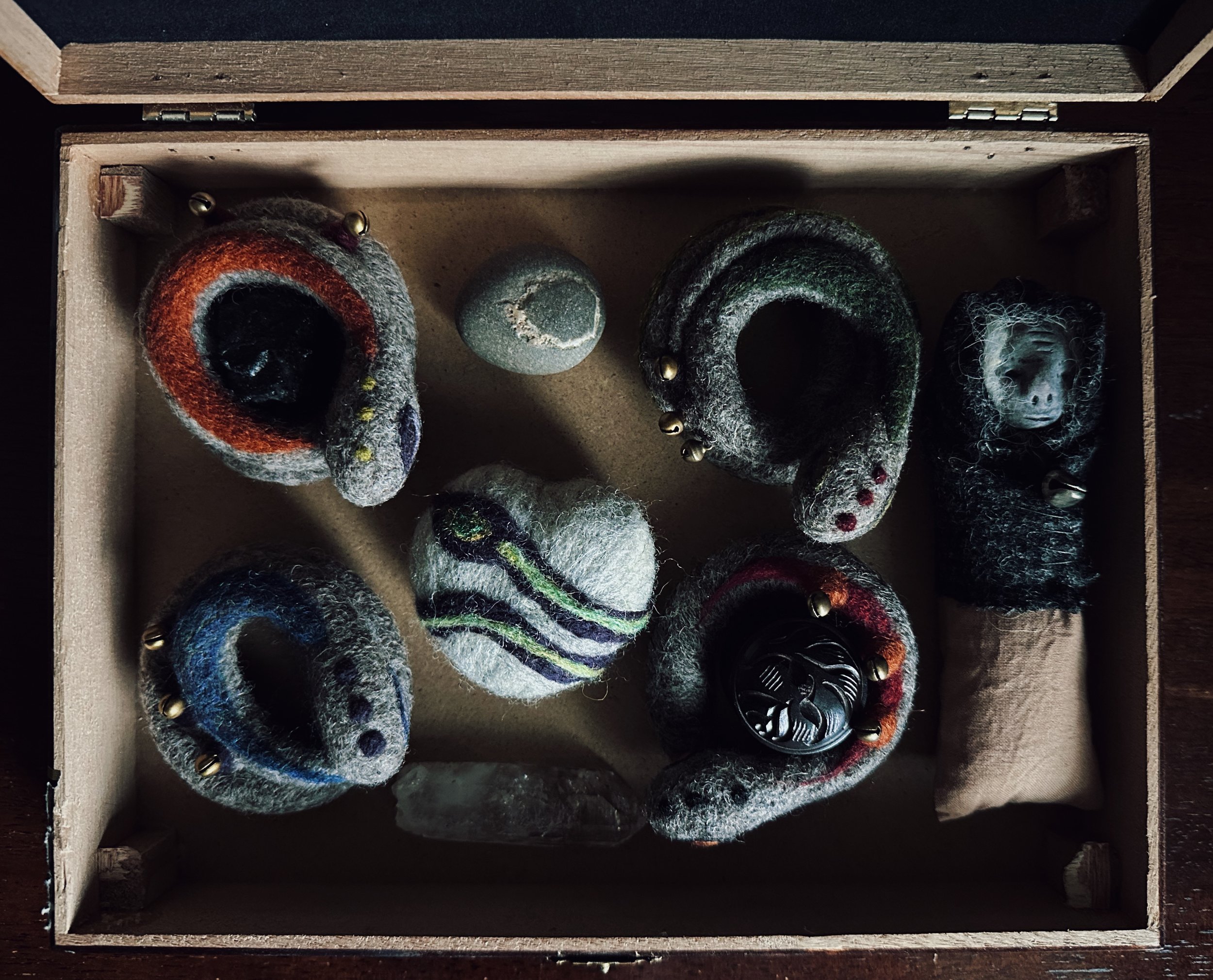 Something about seeing them together like this feels deeply satisfying to me. Tucked in alongside the talismans and doll* above are a clear quartz wand, a piece of black tourmaline, a stone that I found after a winter solstice ritual last year (and that reminds me of a solar eclipse), and a tiny box, intricately carved and filled with sacred medicines.